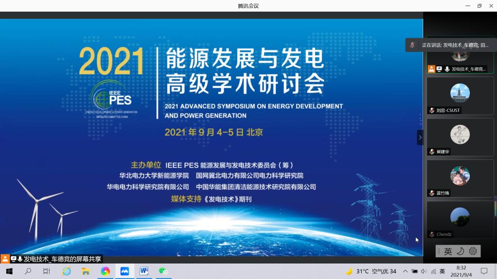 由IEEE PES能源发展与发电专业技术委员会(筹)和华北电力大学联合主办的 “2021能源发展与发电高级学术研讨会”于2021年9月4-5日在北京召开,本次会议在线同步直播。我院教师刘忠副教授全程参加了线上会议。