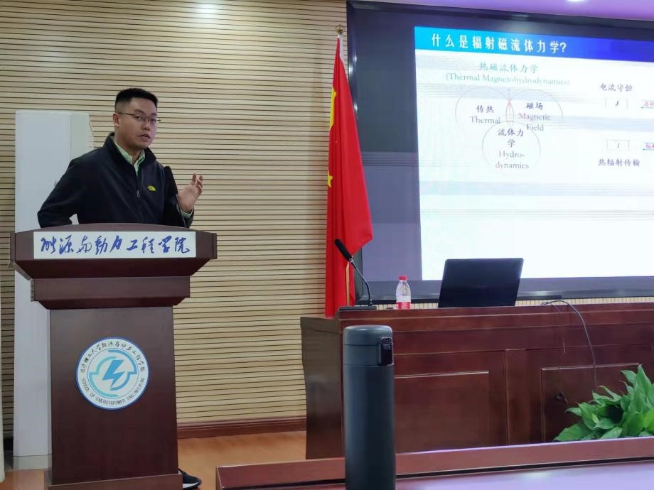 王唯作题为《纳米流体在强化传热及光热利用领域的研究》的报告,他首先向大家介绍了辐射磁流体流动与传热特性研究的内容,之后详细介绍了纳米流体流动及其在新能源领域的热点研究。最后,王唯还对在场同学提出的问题做了细致的解答。