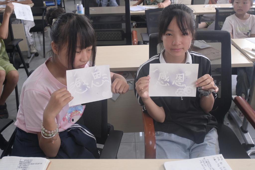 在细致的实验安全规范讲解后,孩子们屏住呼吸,用蘸取了维生素C溶液的小手,在纸上写下心底深藏的话——或是思念远方父母,或是感谢爷爷奶奶……随后,字迹渐渐隐去,彷佛藏起了害羞的心事。当碘伏再次喷洒,亲手书写的字迹,在纸上一点点地慢慢显现。这一刻教室里安静下来,孩子们眼里泛起泪花。那些细腻的心思、丰沛的情感,此刻却借助科学的“魔力”,化作了看得见的温暖印记,在无声的实验中完成了最真挚的表达。
