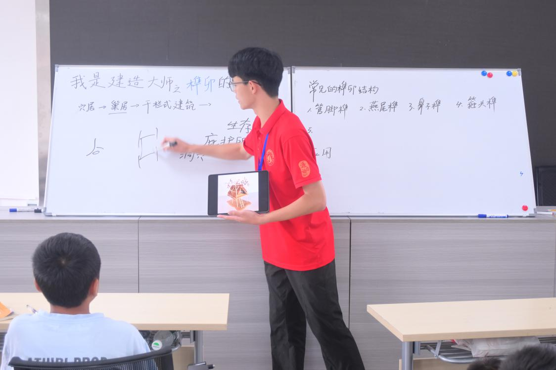 “在野外没钉子没胶水,怎么搭出稳固的庇护所?”队员罗中杰抛出的“荒野求生题”,瞬间点燃了孩子们的好奇心。课堂上,他从野外生存的实用需求切入,借助图片与简易榫卯模型层层讲解,一步步揭开榫卯结构的神秘面纱——原来古人不用一钉一胶,仅靠木材的凹凸咬合,就能建造出稳如磐石的建筑。