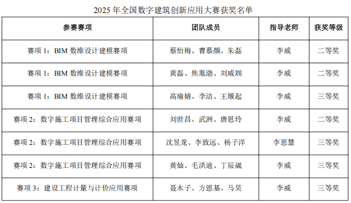 11月3日,由中国建设教育协会主办,国家数字建筑行业产教融合共同体及广联达科技股份有限公司联合协办的2025年全国数字建筑创新应用大赛全国总决赛获奖名单公布,能动学院学子荣获全国二等奖3项、三等奖4项。
