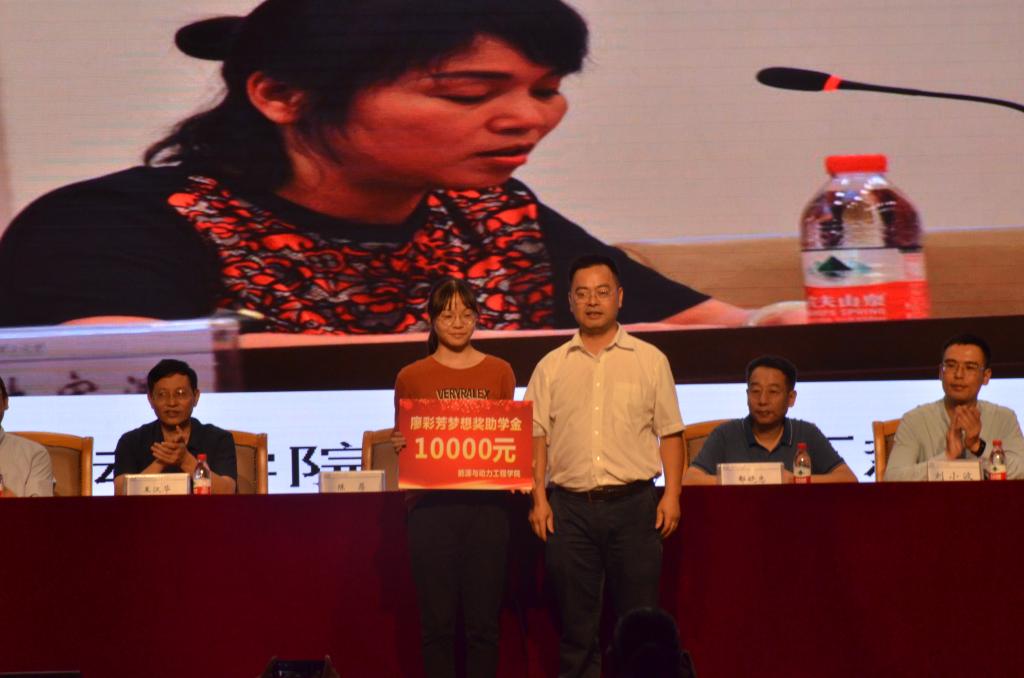 会议第一项,全体起立,奏唱国歌。随后,杨雪峰宣读了喻春、廖娟等27位廖彩芳梦想奖助学金获得者名单,并依次颁发奖助学金。廖彩芳女士是能动学院85届电厂热能动力专业毕业生,参加工作后不忘学校培育之恩,向学校捐助100万元“梦想奖助学金”用于资助学院勤奋好学、家庭困难的学生。