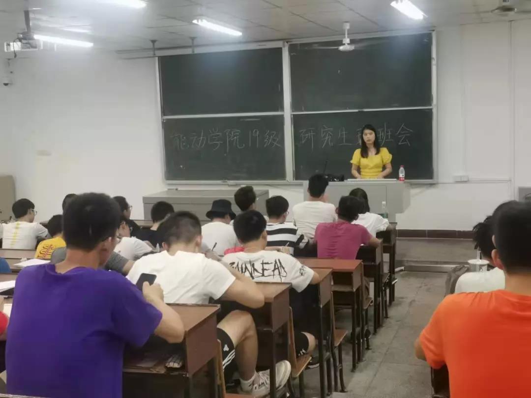 9月8日晚18:30,能源与动力工程学院2019级研究生新生第一次班会在金盆岭校区四教310召开,研究生辅导员代佳欣,2018级研究生班班长蒋盈、院研会主席团成员于淼、黄才友、侯勤加、彭腾,能动学院研究生党支部副书记李虎、青年委员林逸安及2019级全体研究生新生参加会议。