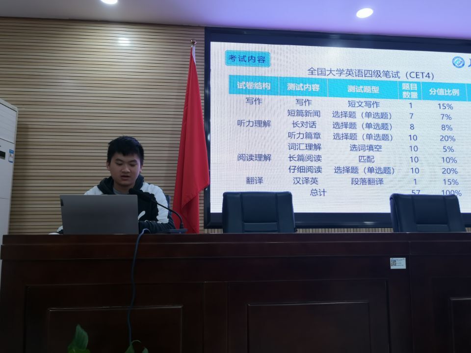 12月15日下午,为帮助学院大三学子顺利通过大学生英语四六级等级考试,能动学院于云塘校区新能源大楼502室举行2019级本科生四六级经验分享冲刺大会,学工办李文豪老师参加。