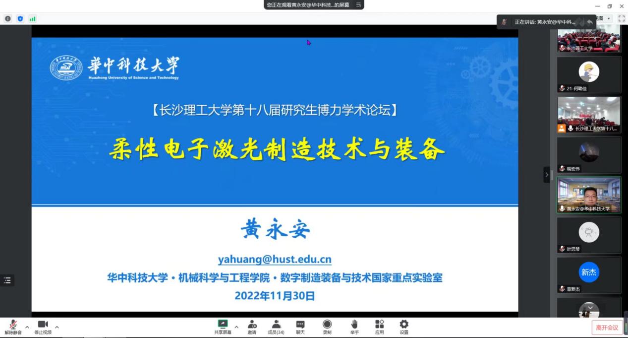 2022年11月30日9:40,华中科技大学教授、博士生导师,数字制造装备与技术国家重点实验室副主任、国家杰青黄永安教授受汽机学院邀请做客威廉体育第十八届研究生博力学术论坛“智能车辆与智造前沿”专题论坛。本次报告由汽机学院副院长胡林主持,副院长毛聪、副院长尹来容、章杰、罗源嫱、王丹琦等教师及部分研究生参加了本次报告。