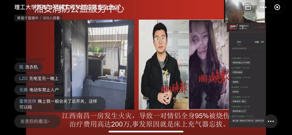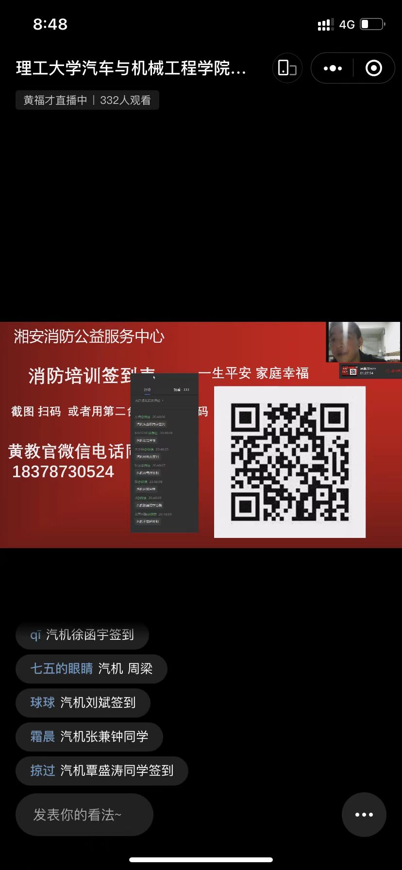 直播间,黄教官以文字、图片、视频等形式,向师生们列举了各种类型的火灾案例和灾后伤亡的惨痛数据来指出掌握消防安全知识、提高消防安全意识、增强自防自救能力的重要性。介绍了火灾发生的原因、如何灭火、怎样逃生自救等消防安全知识,为师生们预防火灾及安全自救提出了若干建议。同时,阐述了疫情期间的相关防护知识,要求广大师生严格遵守学校规定,戴口罩、勤洗手、少聚集、按时接种新冠疫苗。培训会上,采用二维码扫码方式进行签到,并就相关问题开展了激烈的在线互动培训答疑,共发布评论1974条,黄教官就师生所提的问题进行了解释说明,大家受益匪浅。