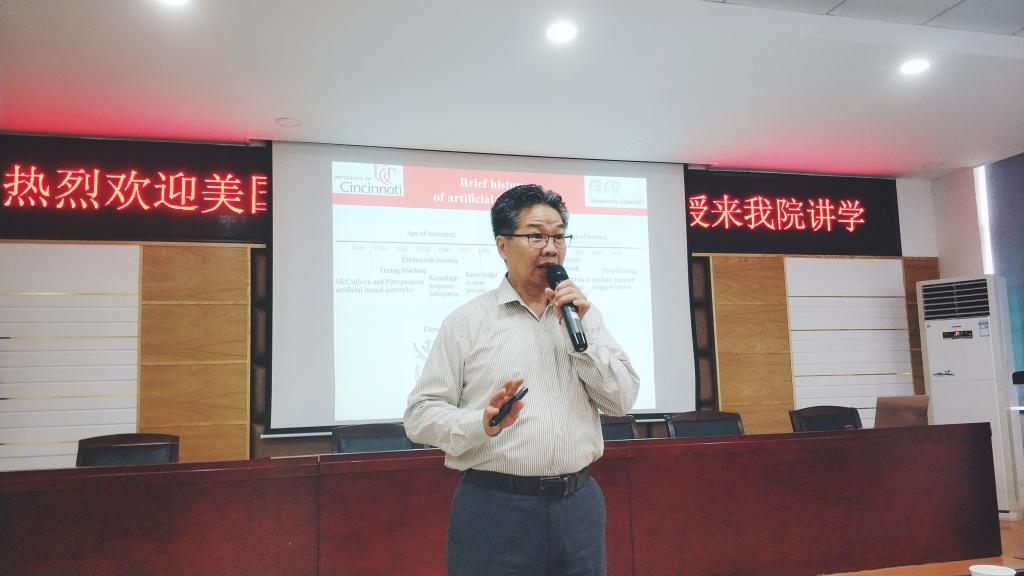 首先,刘桂荣教授介绍了他的求学经历、工作经历及主要研究成果;随后,刘桂荣教授以人工智能(AI)标识——人工神经网络的定义为出发点,简要阐述了人工神经的研究现状和发展趋势,并从神经网络的正、逆向传播方面给大家展示了人工神经网络的运行,针对其训练过程计算量大、耗时长且训练结果只能解决较简单问题的缺点,刘桂荣教授团队提出了先用主成分分析(PCA)算法提取需计算数据的关键分量,再进行训练过程的改进方法,经分析可缩短40%计算时间;最后在提问环节刘桂荣教授热情解答老师同学们的问题,对国内外的教育作了较细腻的分析并向大家强调基础教育(数学与力学)的重要性。