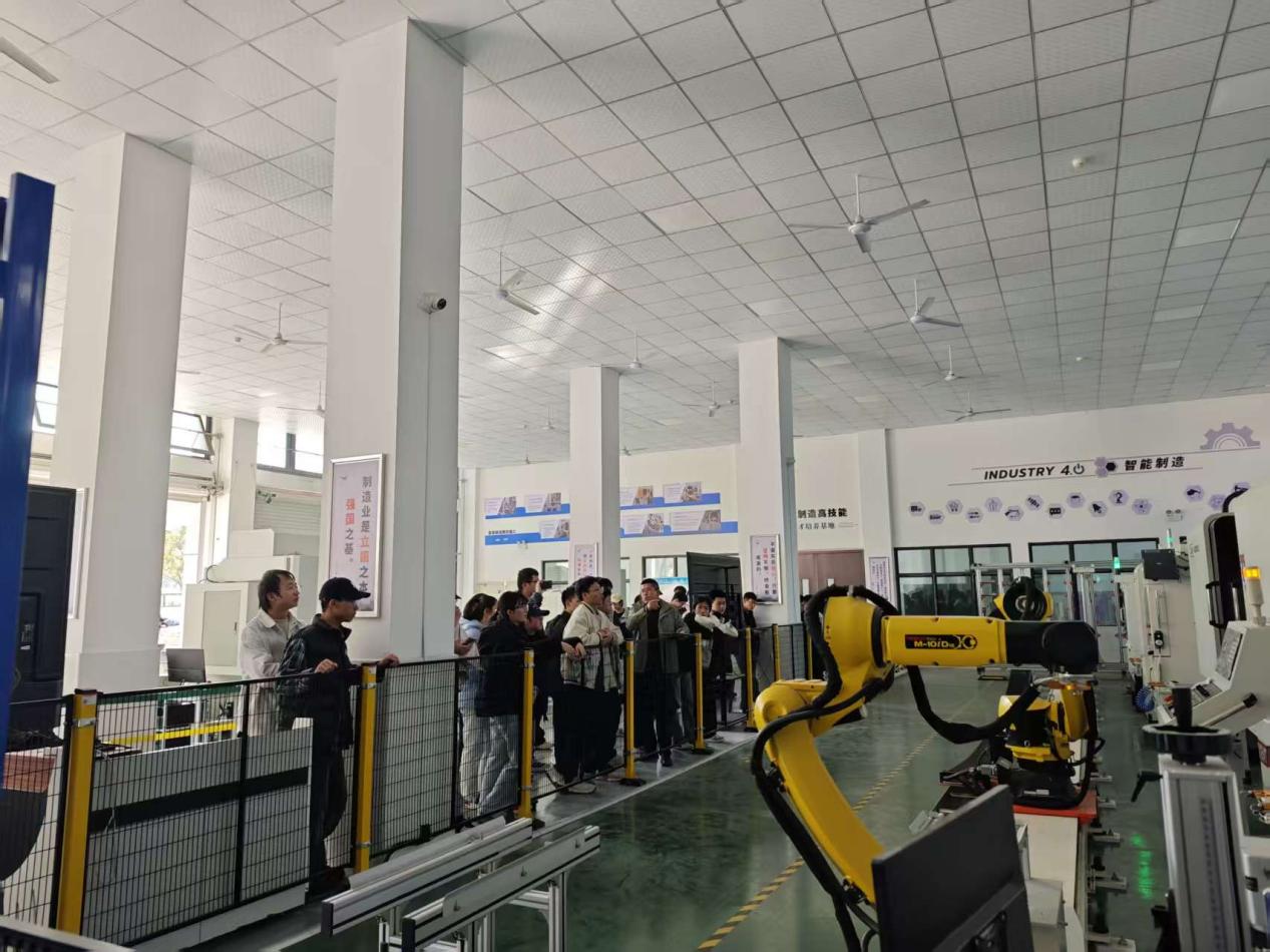 在长沙学院智能制造实训中心,同学们近距离观摩了先进智能制造产线的运行及原理。李琨副教授结合具体设备,系统讲解了工业机器人、智能传感系统、数控加工中心及自动化物流装备的关键技术要点与操作规范。“这套柔性制造系统充分体现了智能制造‘感知-决策-执行’的完整闭环”。教学过程中,两校教师协同指导,围绕同一产线设备,从不同专业角度启发学生思考,生动体现了“协同育人”的理念。