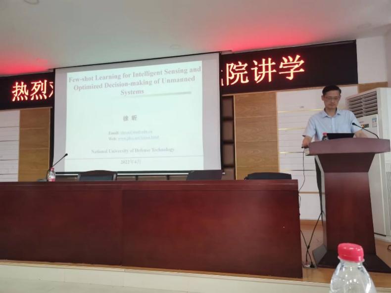 徐昕教授的讲座主题是无人系统智能感知与优化控制的小样本学习方法。首先徐教授从无人系统的自主控制与强化学习进行讲解,他指出机器人和无人系统在各类复杂任务场景中,需要具备对环境中的各类目标进行高精度的鲁棒检测、识别和跟踪,并且具有场景和行为的语义理解能力。徐教授强调,面对环境的复杂性,如何结合环境的复杂约束条件和机器人动力学特性,进行实时运动规划和自适应优化控制是当前研究的重点和难点。其次,徐教授就鲁棒性问题,提出了基于数据增广的鲁棒深度半监督超限学习方法,该方法具有强抗噪能力,在多个半监督学习分类数据集上优势明显。之后,徐教授对机器人三维目标对称性检测的弱监督学习,提出了利用单视角RGB-D图像实现物体对称性预测的弱监督学习方法,且此方法已在两类三维对称性预测数据集上取得了最佳的性能。此外,徐教授还对强化学习的多核特征表示进行了讲解,利用多个核函数的线性组合,用典型的核函数宽度来表征大范围数据特性,能够把初始样本特征映射到高维空间,提高值函数与策略的逼近精度。最后,徐教授对未来提出了诸多展望,他提出,结合领域知识的自主学习,进一步完善机器人感知与决策的特征学习理论;复杂环境中机器人系统的在线持续学习,从数据中学习自我评价函数,减少算法对网络结构和参数敏感性。