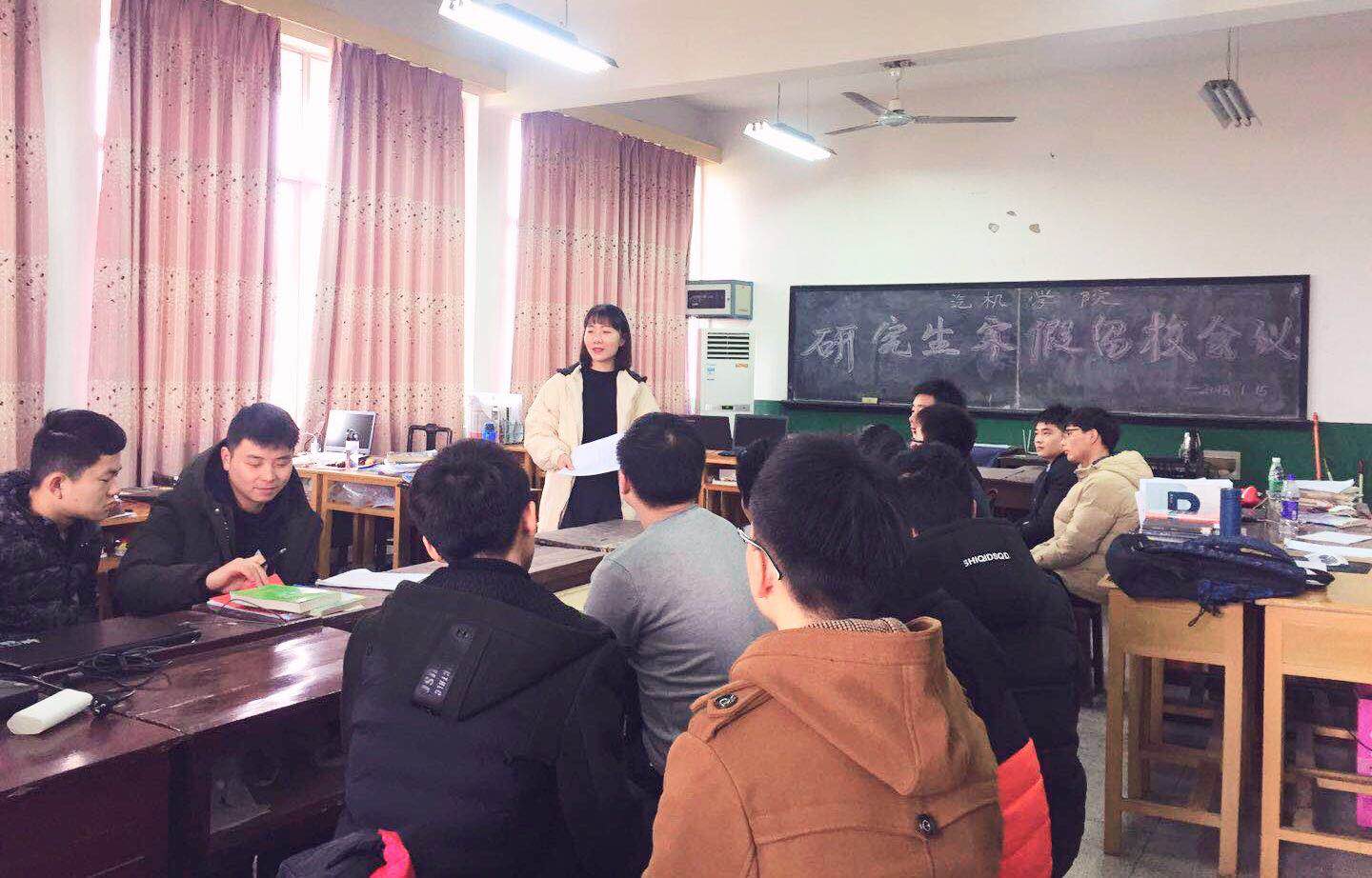 为进一步做好研究生寒假安全教育与引导工作,确保寒假留校学生的学习生活秩序稳定。1月15日上午10点,汽机学院在金盆岭校区九教417召开研究生寒假留校安全会议,会议由研究生辅导员宋新老师主持,汽机学院申请寒假留校的研究生均到场参加会议。