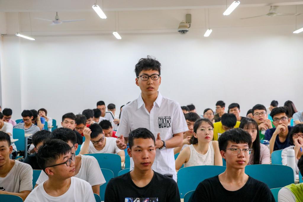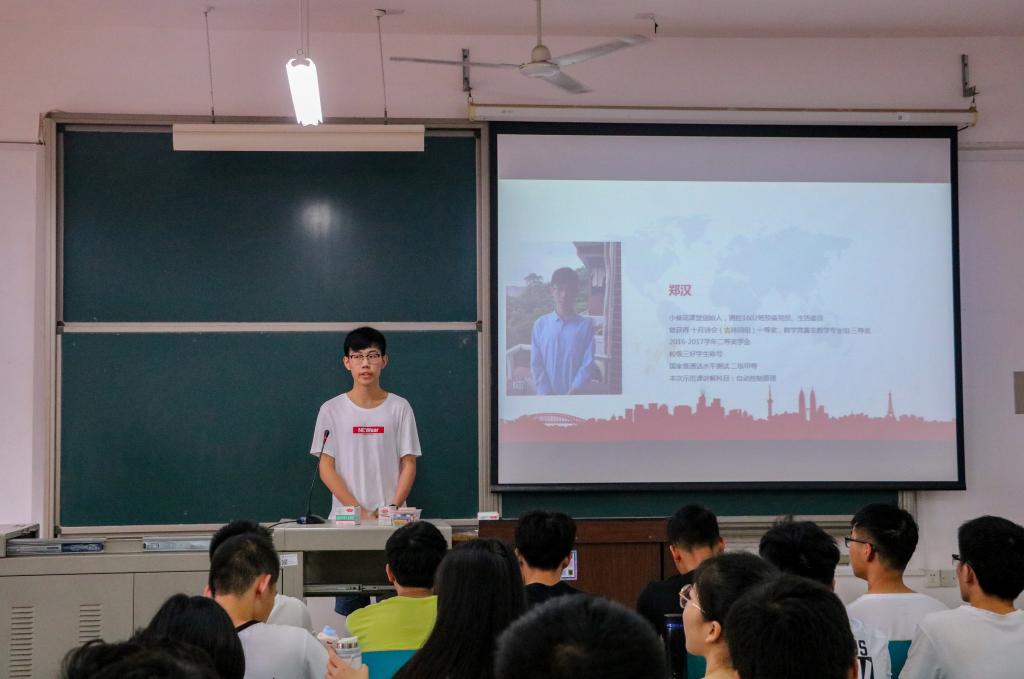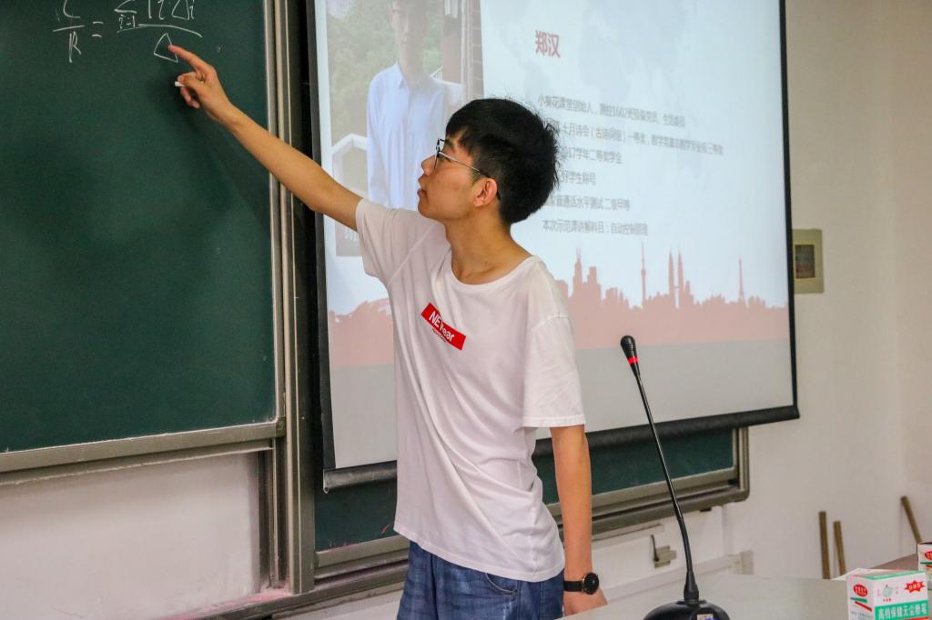 接下来,示范课宣讲开始。本次示范课讲解科目为自动控制原理,由郑汉同学主讲。郑汉同学是“小葵花课堂”创始人、测控1602班预备党员、生活委员,曾获得十月诗会(古诗词组)一等奖、数学竞赛非数学专业组三等奖、2016-2017学年二等奖学金、校级三好学生称号、国家普通话水平测试二级甲等。课堂上,他结合例题,分别针对“梅逊公式”、“根轨迹法”等自动控制原理重难点进行讲解。课堂生动有趣,同学们也十分认真的听讲、问答环节积极发问,课堂气氛活跃,掌声不断。