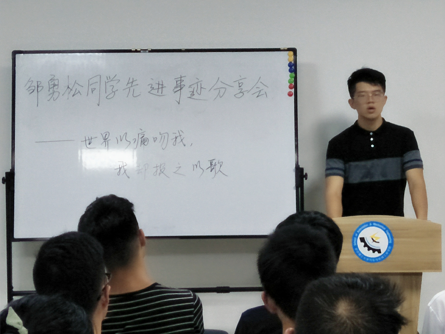 2018年6月7日晚7点,威廉体育williamhill汽车与机械工程学院在行五活动室组织举行了“世界以痛吻我,我要报之以歌——邹勇松先进事迹分享会”。汽机学院学生会主席卢文杰和学生会其他成员出席了此次分享会。