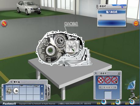 实验效果:利用先进的计算机仿真虚拟技术实现由简单的电脑操作对汽车自动变速器进行装配。即学生在计算机上可以通过此功能模拟装配汽车自动变速器各部件及总成,了解装配的基本知识,系统会根据每一次的装配时间和出错情况对操作学员的装配结果自动进行评分。仿真实验既提高了学生的学习兴趣和效率,又降低了学校的教学成本和时间成本。