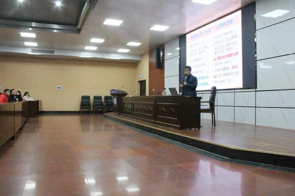 讲座伊始,易教授简单介绍了战争时期,高校迁移的大致情况,引出了讲座的主题。易教授介绍了当初教育部决定将高校迁移到长沙的原因,同时指出部分高校在战争时期内迁次数频繁,饱受战祸之苦;展现了部分高校组建了步行团,带领学生进行转移,共同抗战的艰苦场景。