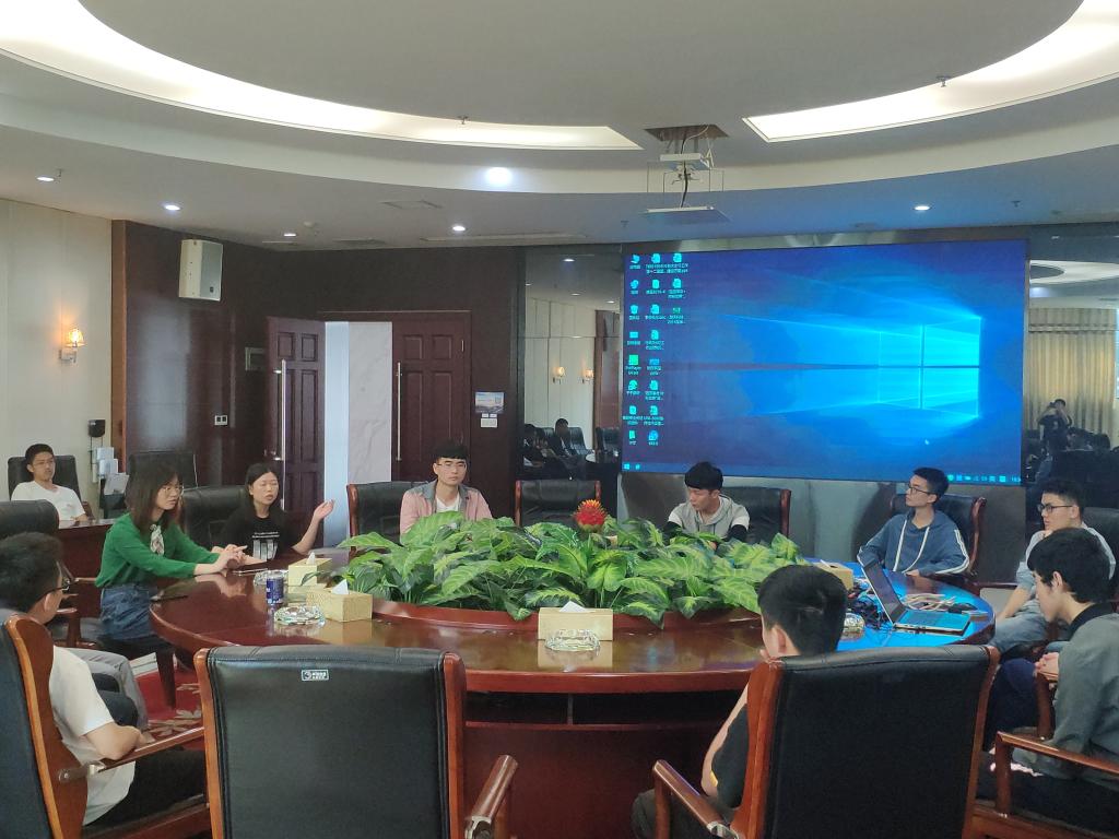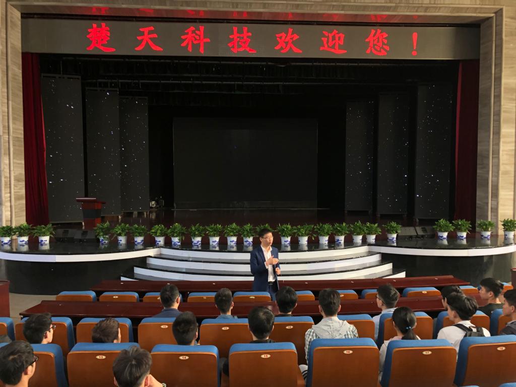 在交流会议室,人力资源唐美强科长和学姐以探讨答疑的方式和同学们进行交流,同学们对楚天科技有着浓厚的兴趣,积极进行提问: