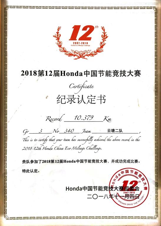 车队参加了燃油车组比赛,车名为“云影二号”。队员总结以往的经验教训,不断学习新知识、新技术,在探索中谋求更好的创新,克服了技术短缺、知识欠缺、资金不足等困难。在第十届中国Honda节能竞技大赛,取得了预赛“第十二名”,决赛“第十九名”的成绩。