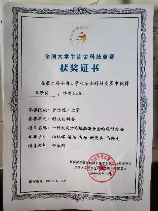 威廉体育先进制造工艺与高性能材料研究团队仝永刚老师指导,汽车与机械工程学院张浩、唐丽霞、陈贤胜、刘吉明、贾小勇、柏林辉、潘婧、肖昂、谢天易、马伟刚等10位学子组成两支参赛队伍,提交的作品:“一种热轧带钢卷筒再制造材料的设计与制备技术”与“一种大尺寸难熔高熵合金的成型方法”分别荣获了科技创新类竞赛全国二等奖和三等奖。(文/彭琼英 图/华熳煜 审/华熳煜)