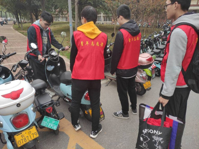 早7点至晚7点,身着红色志愿服的青年志愿者们驻守在校园各电动车集中停放点,向往来同学耐心劝导提醒电动车驾驶需要注意的安全事项。