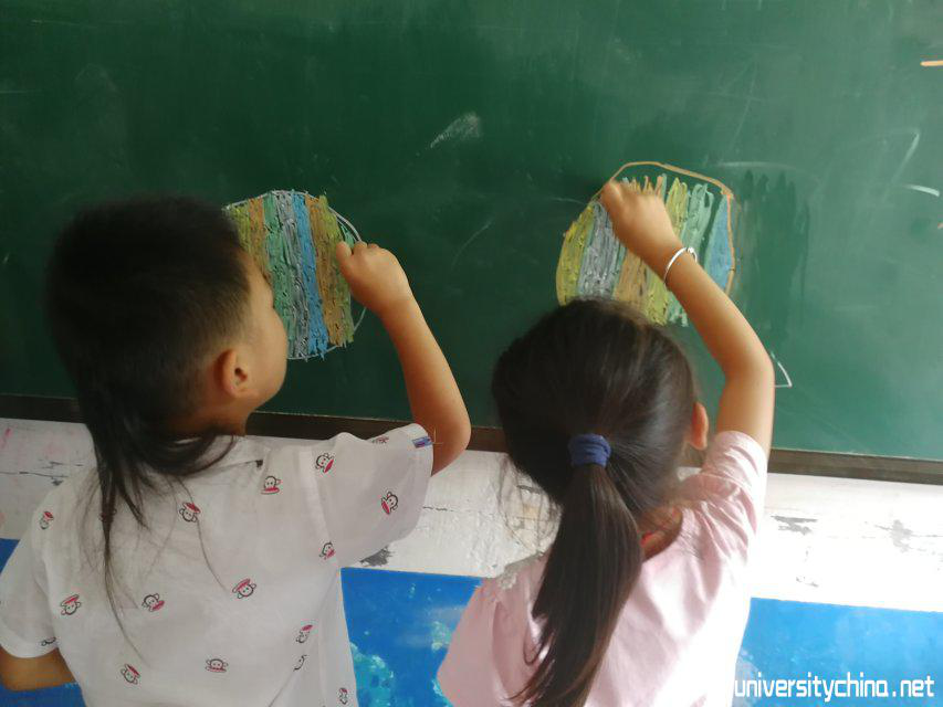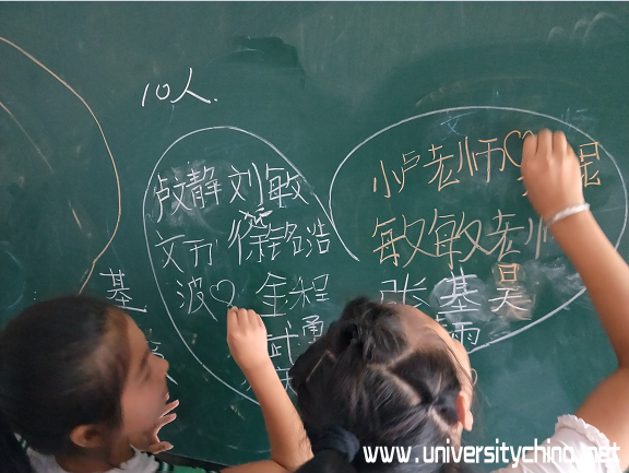放学后,住得近的几个孩子还留在学校里打篮球,当老师走进教室,看到暖心的一幕——孩子们在黑板上画着爱心,写的都是支教队老师的名字,他们用自己最直接也最朴素的方式表达着对老师的喜欢和爱意。