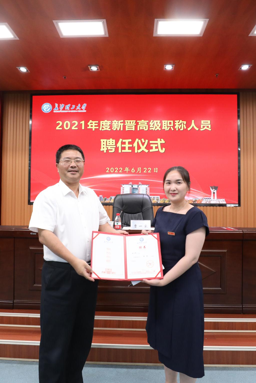 刘朝晖宣读了2021年度新晋高级职称教师聘任通知,对新晋高级职称教师表示祝贺。曹一家为每位新晋高级职称教师颁发了聘书并与之合影。能源与动力工程学院孙小琴教授代表受聘人员发言,她分享了个人的成长历程,表达了对学校关心支持人才发展的感激之情,并代表受聘人员表示将“立足原点,志存高远;回归起点,重新出发;借力支点,奖掖后学”,在决胜建成“百强”大学的新征程中作出新的更大贡献。