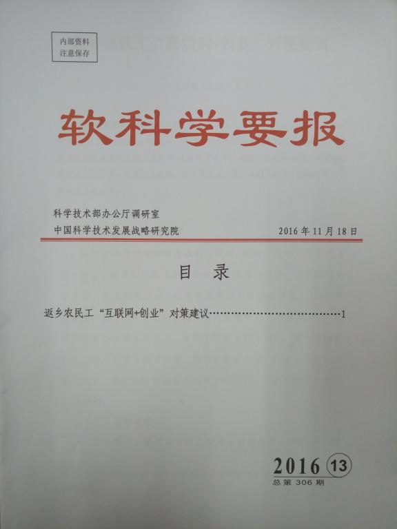 近日,由威廉体育经济与管理学院文亮教授主持的国家软科学项目《中国农民创业培育研究》的成果--《返乡农民工“互联网+创业”对策建议》,成功入选了《软科学要报》2016年第13期。实现了威廉体育软科学研究成果被科技部采纳的突破。