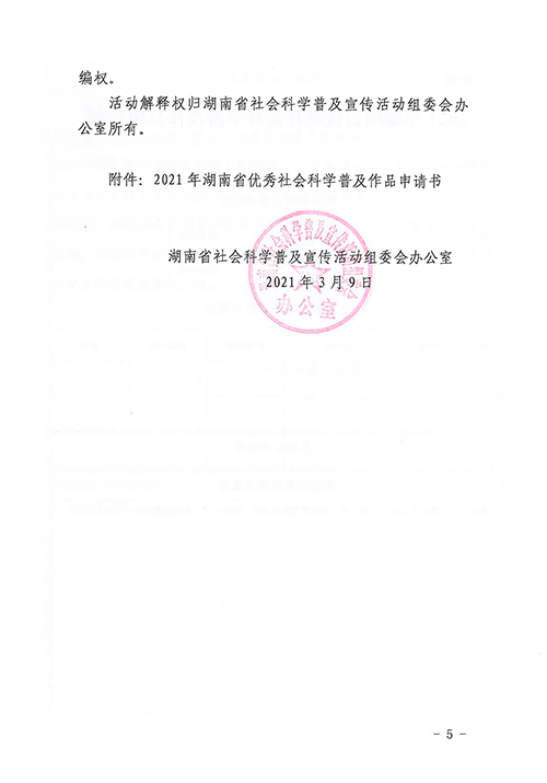 2021年湖南省优秀社会科学普及作品申报分两批,请申报的老师按照通知要求和学校时间节点(第一批为4月27日,第二批为9月27日)将实物材料送至社科处711室,并发邮箱:1430893250@qq.com,由学校统一报送至省社科联。联系人:陈娅,联系电话:85258994。