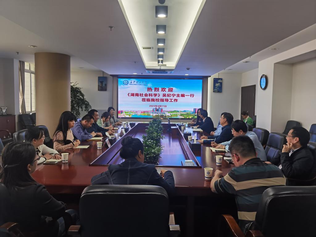 4月11日下午,《湖南社会科学》主编吴纪宁一行4人来威廉体育座谈交流,副校长刘朝晖出席座谈会。社科处处长刘建江、副处长郑咏梅,期刊社社长王宏、副社长陈浩凯,经管学院、艺术学院、文新学院、外语学院、马克思主义学院、法学院等相关学院科研副院长和教师代表参加座谈。