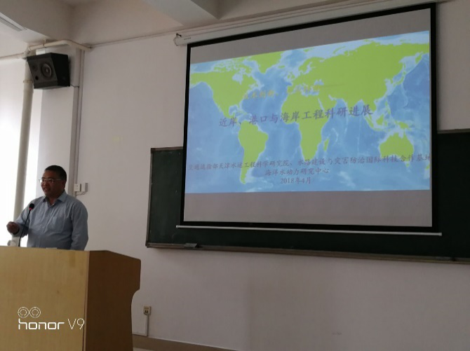 “近岸、港口与海岸工程科研进展”和“天科院大比尺波浪水槽研究应用情况”的学术报告。本次报告由我院姚宇副教授主持,夏波博士、黄筱云博士、刘智光博士、江诗群老师以及相关专业的研究生、本科生40余人参加了本次学术活动。