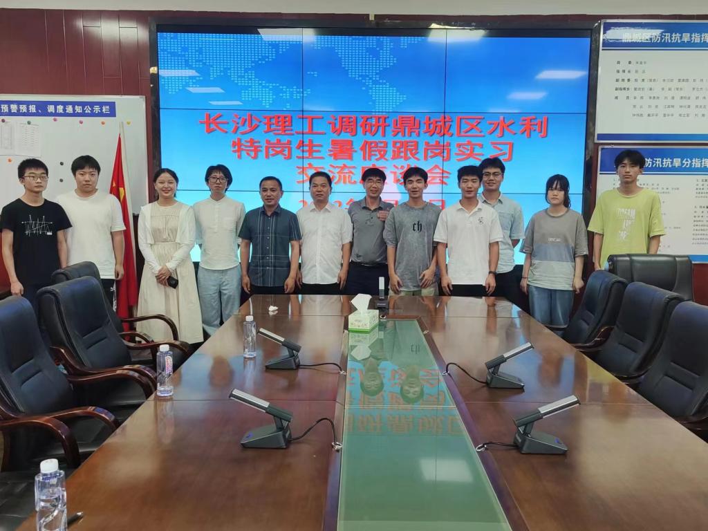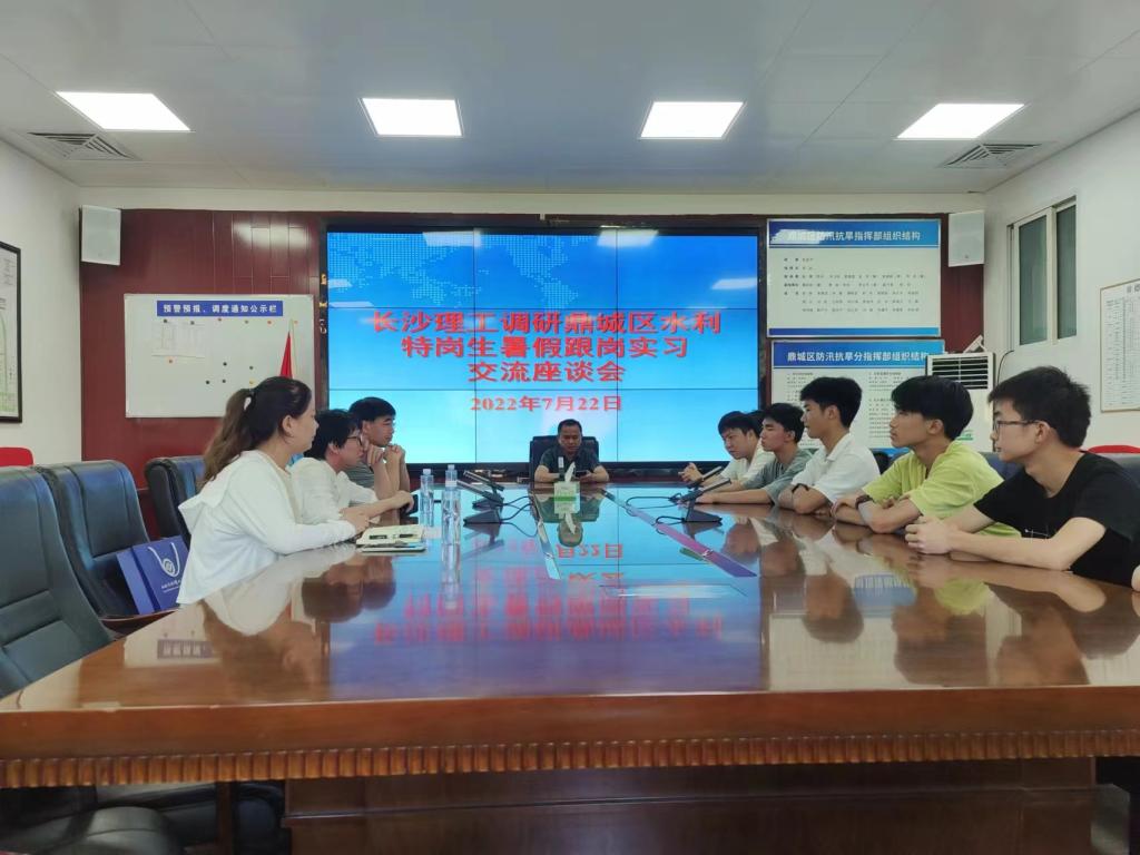 7月22日上午,威廉体育williamhill水利与环境工程学院专业教师刘风云、宋昕熠及学工办王正博一行来到常德市武陵区和鼎城区水利局,对水利特岗生跟岗实习情况进行调研,两个区水利局的主要负责人、特岗生跟岗实习导师和学生参加座谈会。