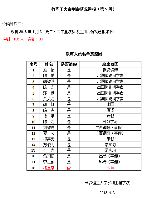 教职工大会到会情况通报(第5周)