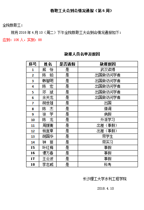 教职工大会到会情况通报(第6周)
