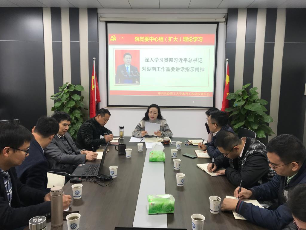 11月8日上午,水利工程学院党委召开了学院中心组(扩大)会议,专题学习 “习近平总书记对湖南工作的重要指示精神”,全体院领导、党委委员、院长助理、各系主任、支部书记、重点实验室(水沙、洞庭湖)负责人、党政办主任、党务干事参加学习,会议由院党委书记喻玲娜主持。