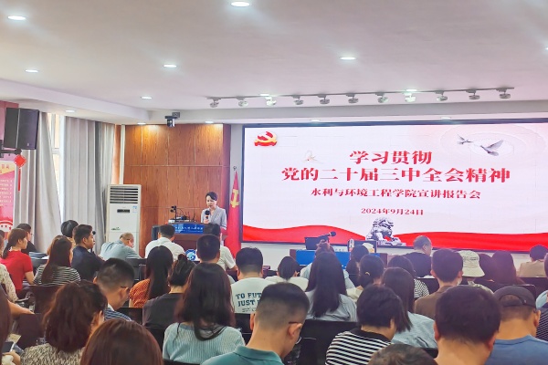 9月24日下午,副校长钱国平在工三B319为水利与环境工程学院全体教职工开展学习贯彻党的二十届三中全会精神宣讲。水利学院党委书记喻玲娜主持,学院全体教职工参加宣讲会。