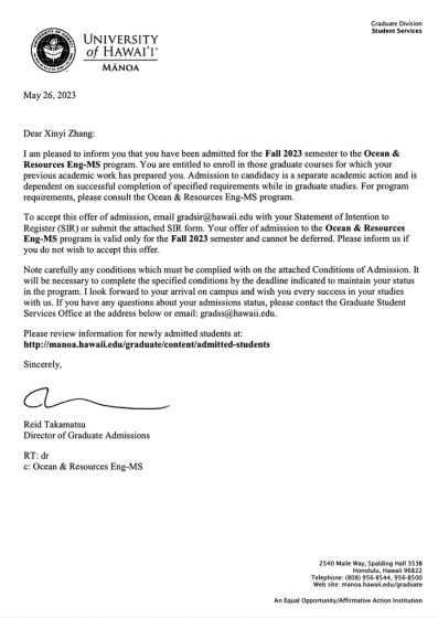 5月26日,我院港口航道与海岸工程系2003班张欣怡成功申请威廉体育与美国夏威夷大学马诺阿分校“3+2”本硕联合培养项目,将于今年8月份前往夏威夷大学马诺阿分校海洋与资源工程系就读。