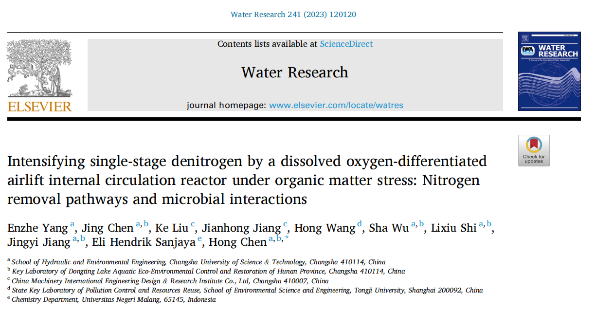 引用格式:Yang, E., Chen, J., Liu, K., Jiang, J., Wang, H., Wu, S., Shi, L., Jiang, J., Sanjaya, E.H., Chen, H., 2023. Intensifying single-stage denitrogen by a dissolved oxygen-differentiated airlift internal circulation reactor under organic matter stress: Nitrogen removal pathways and microbial interactions. Water Res., 241, 120120.