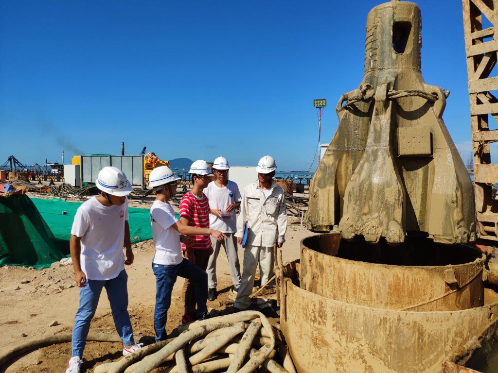 工程施工现场中,技术人员给我们讲道:泥浆比重和含砂率检测、沉降和水平位移变形观测、终孔深度,无不凸显着施工过程中的细节化、精确化。旧码头拆除及加固、码头下清淤、港池水域疏浚、码头水工主体结构、护岸施工,又展示了工程的整体性与全局感。从小处到大处、从局部到整体,团队成员遵循着技术人员的引导与教授,深入到施工现场的考察与项目的学习中,感受将专业知识运用到实践中去的乐趣。