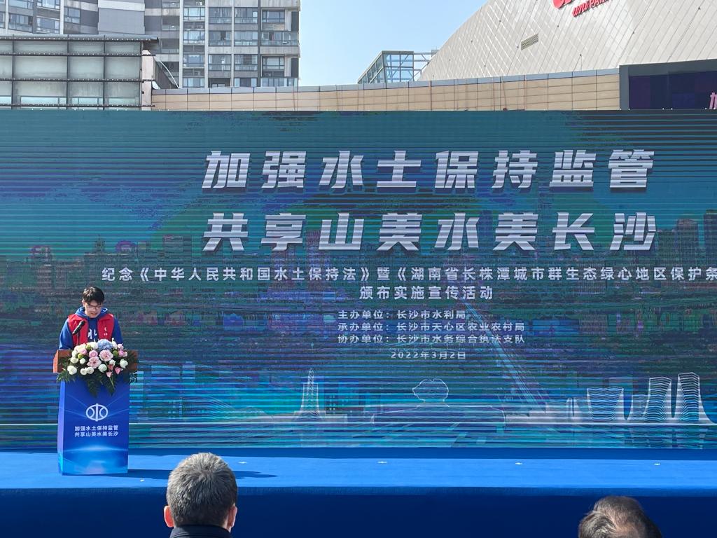 为纪念《中华人民共和国水土保持法》修订实施11周年暨《湖南省长株潭城市群生态绿心地区保护条例》颁布实施9周年,2022年3月2日上午,水利与环境工程学院20余名大学生代表参加了在天心区环宇城举行的“加强水土保持监管,共享山美水美长沙”—《中华人民共和国水土保持法》和《湖南省长株潭城市生态绿心地区保护条例》普法宣传活动。大禹之子青年志愿者协会陈炫达作为社会监督员代表进行现场发言。活动由长沙市水利局主办、天心区农业农村局承办、长沙市水务综合执法支队协办。