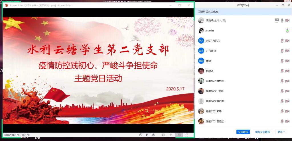 为深入学习贯彻习近平总书记关于疫情防控的重要讲话和指示批示精神,巩固深化“不忘初心、牢记使命”主题教育成果,水利云塘学生第二党支部于2020年5月17日下午16:00,通过召开线上会议开展了“疫情防控践初心、严峻斗争担使命”主题党日活动,共同观看纪录片《这就是中国》,并就其内容进行学习研讨。支部书记邓奕琳、二支部全体党员以及本期发展对象马凯文、孙绪波参加本次党日活动。