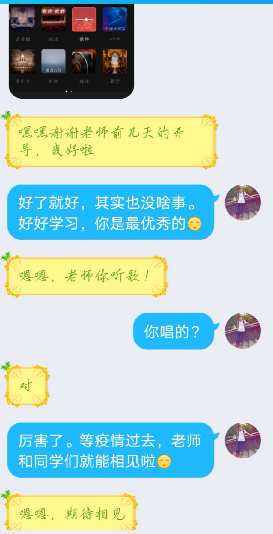 “老师,我想申请回学校住可以吗?我和我妈吵架了,想回学校。”2019级辅导员黄远发老师收到王同学发送的信息后立即同她取得了联系,了解学生的具体情况和遇到的困难。经过同学生深入谈心和学生家长沟通,最终顺利解决了学生的心理疙瘩,打消了学生赌气要返校的念头。