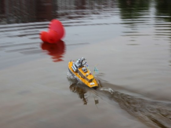 外观评分结束后就是竞速比赛。志愿者们早已在湖边拉起了警戒线。参赛者按照顺序依次进行比赛。形状各异的船只在操纵员的操作下飞溅起高高的浪花,迅速的在湖面上航行,完成各种动作,画出了一条条优美的弧线,最终回到起点,赢得观众的阵阵掌声。有的船只虽然速度慢,但也慢慢悠悠地完成航行。有的船由于设计不够完善,下水后不多远便止步不前,最后只能由救援组将其送回岸边。
