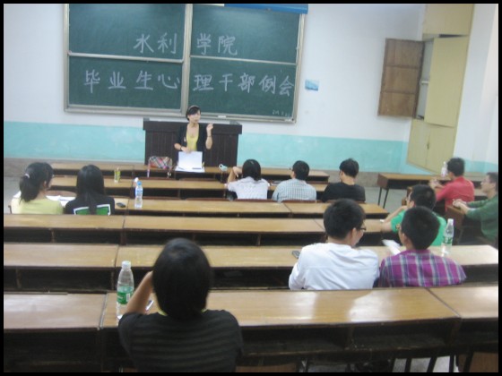 9月26日12点15,水利学院在金盆岭3教115召开了毕业生心理干部例会。本次会议由叶正芳老师主持,08级各班班长和心理委员参加了本次例会。