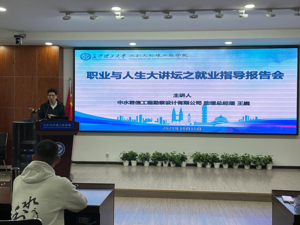 10月16日下午,水利与环境工程学院在工三B319举办职业与人生大讲堂之就业指导报告会,邀请中水君信工程勘察设计有限公司总经理助理王巍作专题报告,学院2018、2019、2020级100余名学生参加,就业辅导员李永睿主持会议。