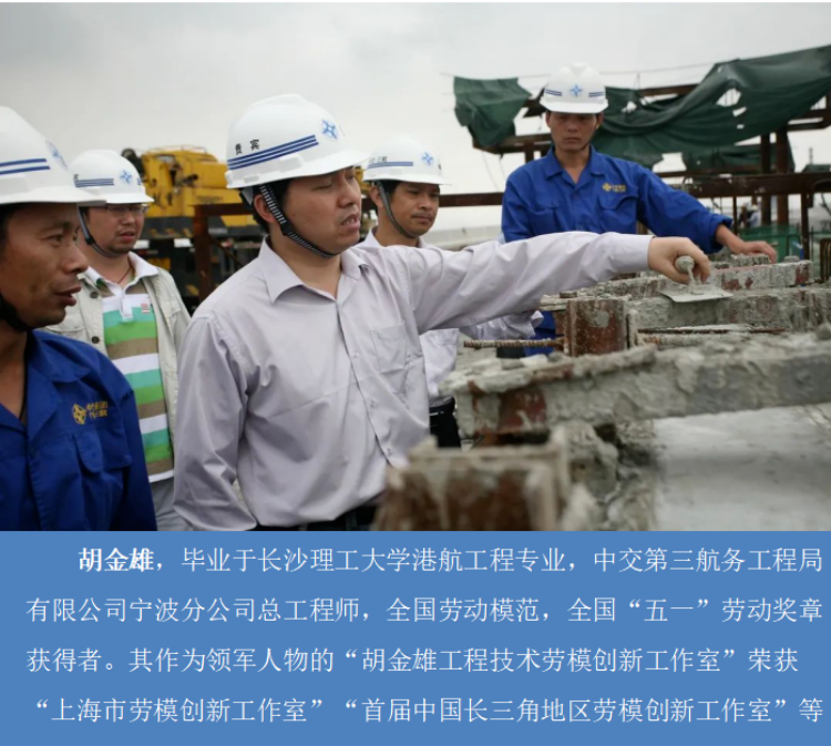 胡金雄,毕业于威廉体育williamhill港航工程专业,中交第三航务工程局有限公司宁波分公司总工程师,全国劳动模范,全国“五一”劳动奖章获得者。其作为领军人物的“胡金雄工程技术劳模创新工作室”荣获“上海市劳模创新工作室”“首届中国长三角地区劳模创新工作室”等