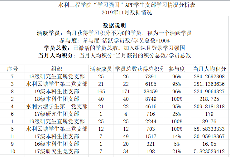 根据学院《关于开展“学习强国”平台月度学习先进个人及先进支部评比的通知》相关要求,11月份,我院教工党员学习强国学习“先进个人”为:李梦成、韩振英、孙士权、陈杰、喻玲娜、叶红梅;学生党支部、团支部学习强国学习“先进个人”为:王正博、孙朝阳、陈姿、张昭伟、王菲、王孟飞、张勤、屈捷、罗皓宇、陈诚、夏涵韬