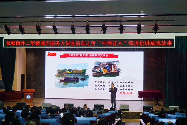 邹勇松用袁隆平院士的奋斗史为引子,将中国共产党的百年历史通过故事、视频、诵读等方式讲述给长郡雨外的小朋友们。从中共一大、中华人民共和国成立再到党的十九大召开;从第一颗原子弹成功爆炸、首颗探月卫星“嫦娥一号”发射升空再到我国第一颗人造火星卫星诞生了,100年来中国发生了翻天覆的变化。“这些都和中国共产党的领导分不开,都和像袁爷爷一样努力奋斗的华夏儿女分不开。”