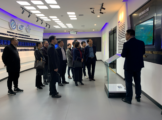实验室邓斌副教授向梁玉香一行简要介绍了水利学院的学科建设、专业设置、人才培养、科研成果应用等方面的情况,随后对洞庭湖基本概况、目前所面临的机遇与挑战,以及洞庭湖实验室的建设历程、发展目标、主要研究方向等进行了详细讲解,并重点介绍了智慧洞庭综合信息化平台,对其功能模块以及应用情况进行了展示。