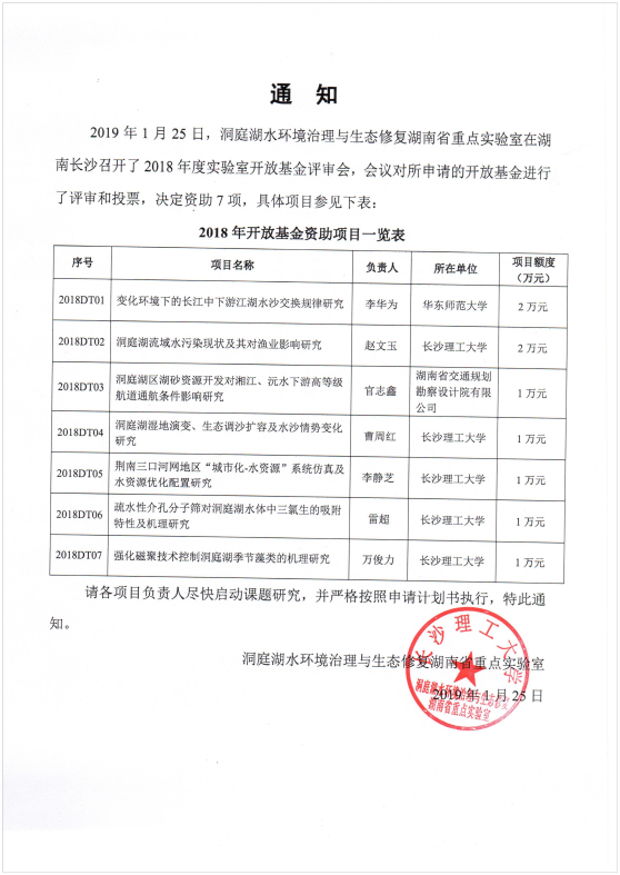 2018年洞庭湖水环境治理与生态修复湖南省重点实验室开放基金批准通知