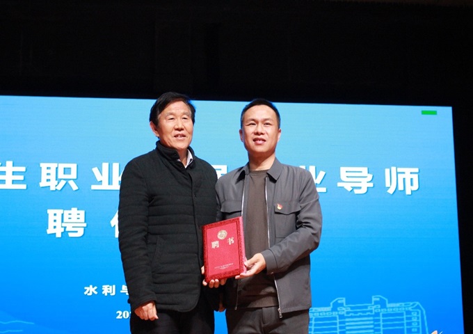 报告会后,校关工委副主任王乃厚为庄稼颁发大学生职业发展企业导师聘书。