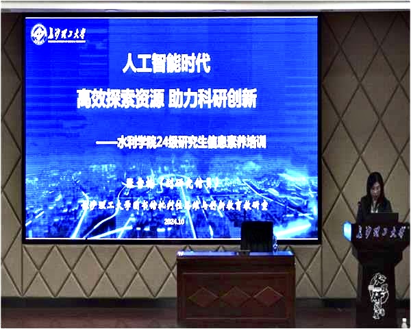 为增强2024级研究生新生文献检索能力,助力科学研究与学术创新,水利学院于10月22日在文科楼A200开展第十六届研究生云影讲坛之“人工智能时代 高效探索资源 助力科研创新”专题讲座。本次讲坛由湖南省高校数字图书馆讲师、教育部科技查新员、信息素养培训专职教师、中国图书馆学会会员张雪梅老师主讲,水利学院2024级全体研究生参加。