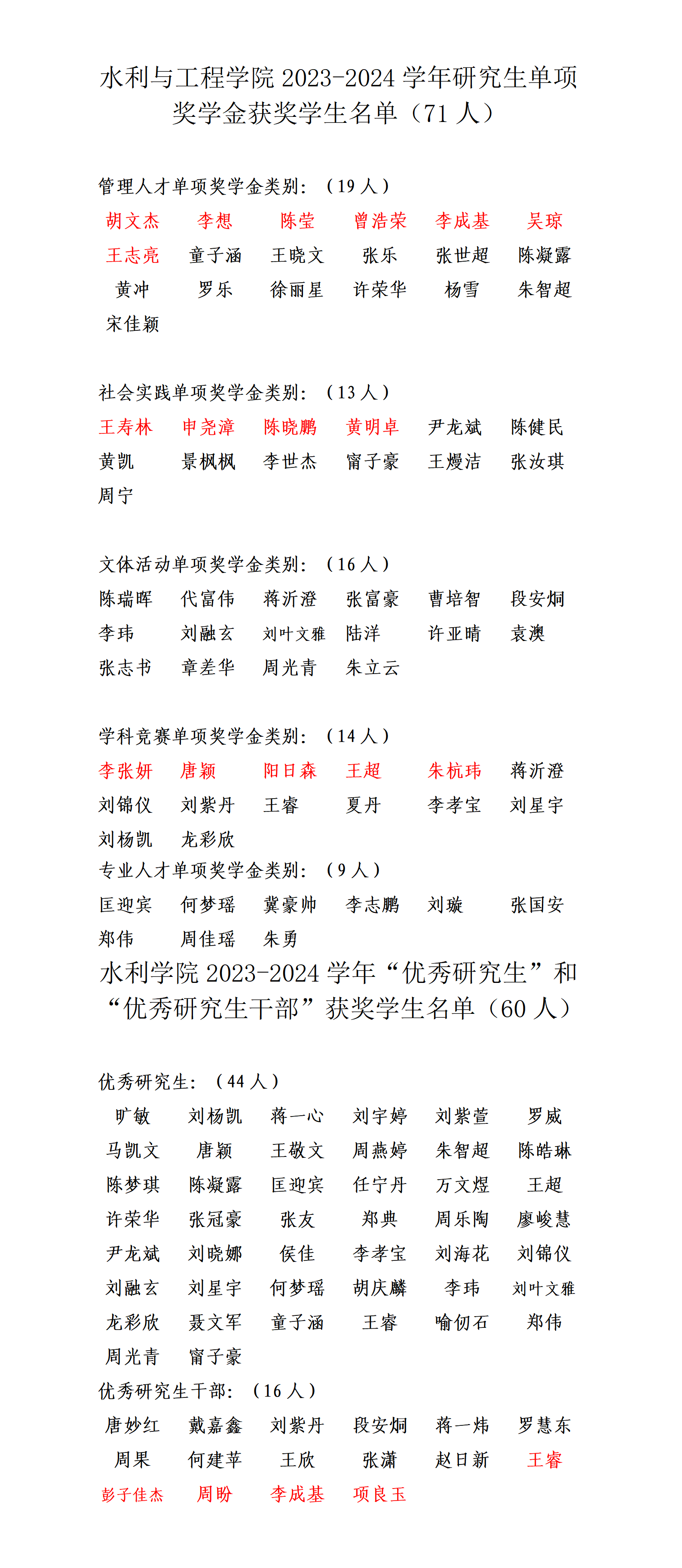 根据《威廉体育williamhill研究生单项奖学金评选办法》与《威廉体育williamhill“优秀研究生”和“优秀研究生干部”评选办法》以及《关于开展2023-2024学年研究生评优表彰及单项奖学金评选工作的通知》要求,经个人申请、班级推荐、资格审查、班级推荐、水利与环境工程学院2023-2024学年度研究生单项奖学金与优秀研究生、优秀研究生干部评审委员会综合评议,现将获奖名单公示如下(标记为红色的为直评同学)。